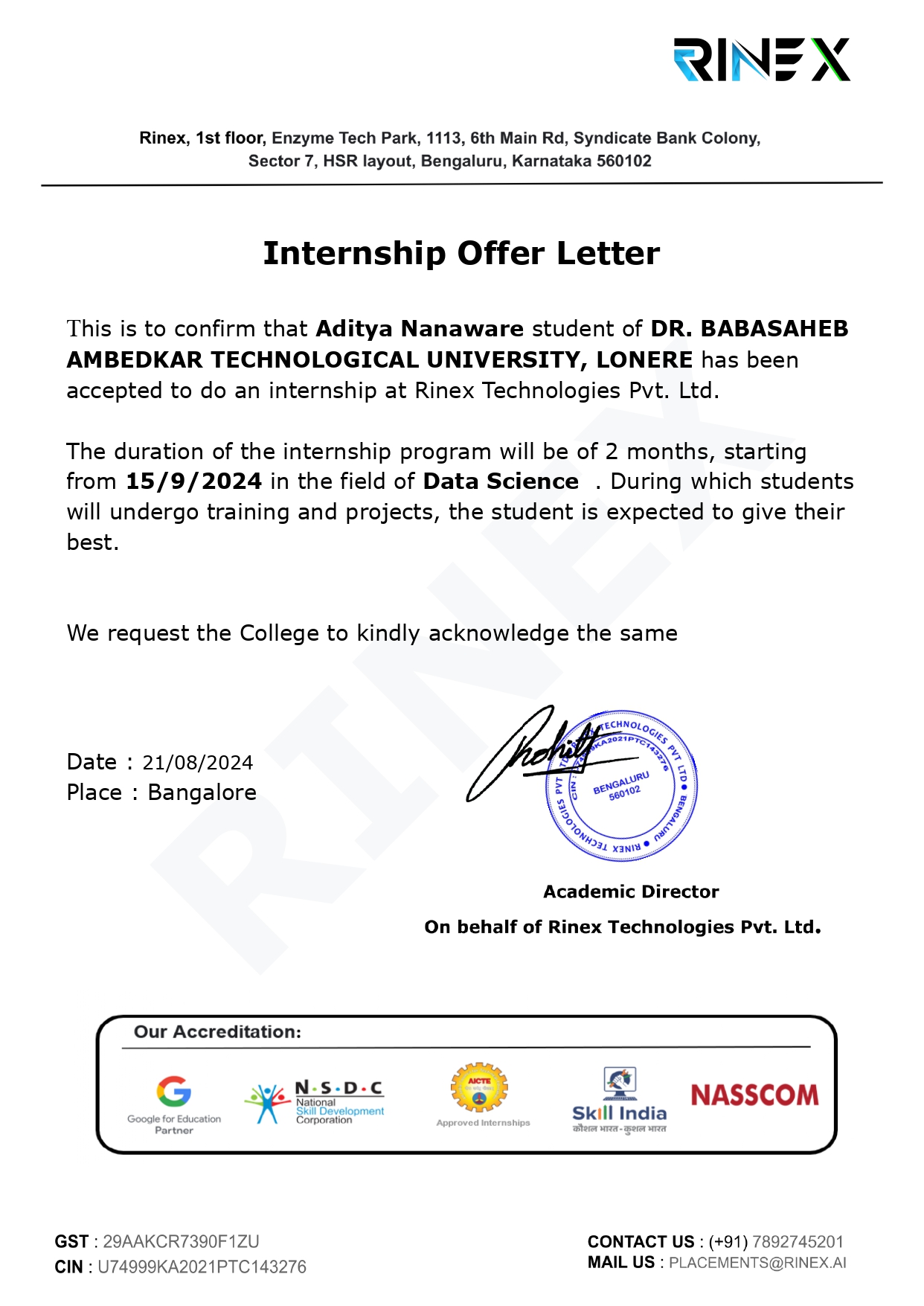 Currently, I am interning at Rinex Technology Pvt. Ltd., where I am honing my data science skills and working on real-world